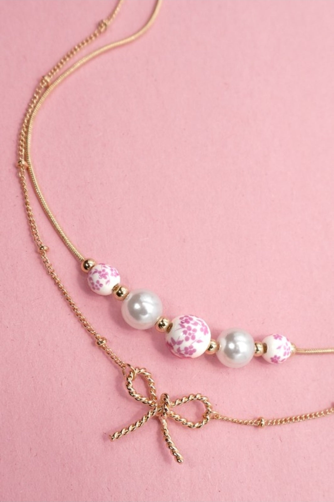 Pink Ceramic Porcelain Pearl Bow Layer Necklace